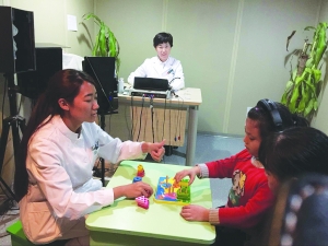 北京兒童醫(yī)院聽力診療中心主任劉海紅(左二)等正在對(duì)患兒進(jìn)行聽覺言語評(píng)估。