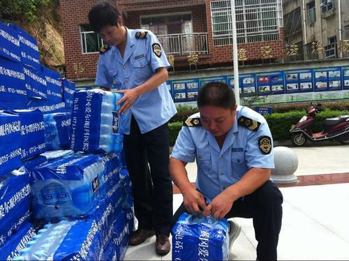 圖為英山縣局執(zhí)法人員對(duì)捐贈(zèng)的飲用水進(jìn)行檢查。(黃娟 攝)
