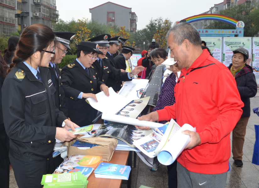 圖為順義區(qū)食藥監(jiān)管局工作人員向居民發(fā)放宣傳資料。 王東海 攝