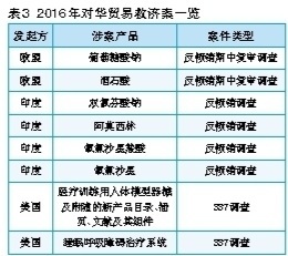 2016年,我國醫(yī)藥產(chǎn)品共遭遇8起國外貿(mào)易救濟(jì)案,涉案產(chǎn)品不僅包含葡萄糖酸鈉、酒石酸、雙氯芬酸鈉、阿莫西林、氧氟沙星羧酸、氧氟沙星等優(yōu)勢原料藥,也涉及醫(yī)療訓(xùn)練用人體模型器械、睡眠呼吸障礙治療系統(tǒng)等我國日益強(qiáng)大的醫(yī)療器械領(lǐng)域(見表3)。面對貿(mào)易救濟(jì)案件數(shù)目的增加,中國醫(yī)藥保健品進(jìn)出口商會會同相關(guān)企業(yè)積極應(yīng)對并取得成效,如2016年歐盟對華酒石酸反傾銷案的應(yīng)訴,是惟一經(jīng)過兩次日落復(fù)審和多次期中復(fù)審仍舊保持零稅率的案例。該案例已成為應(yīng)對歐盟貿(mào)易救濟(jì)案件的經(jīng)典案例。(實(shí)習(xí)記者 落楠)