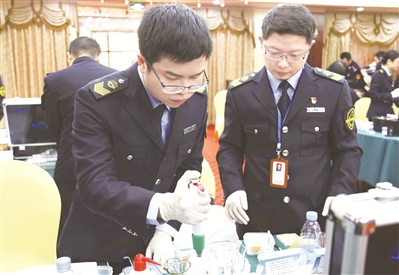 酒店廚房檢查、菜譜審查兩個(gè)環(huán)節(jié)結(jié)束之后,便進(jìn)入了頗具看點(diǎn)的快速檢測(cè)環(huán)節(jié):13支代表隊(duì)通過(guò)現(xiàn)場(chǎng)抽簽并領(lǐng)取待檢測(cè)的食品樣品,必須在規(guī)定時(shí)間內(nèi),通過(guò)現(xiàn)場(chǎng)采樣、調(diào)試檢測(cè)儀器、配制標(biāo)準(zhǔn)液、進(jìn)行理化指標(biāo)測(cè)定等程序,對(duì)包括硼砂(米面制品)、農(nóng)藥殘留(果蔬)等8個(gè)項(xiàng)目進(jìn)行快速檢測(cè),最終找出哪些食品樣品不合格。