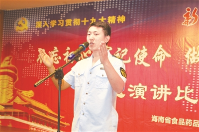 成績的背后是奉獻(xiàn)和付出。近日,海南省食品藥品監(jiān)管局為深入貫徹學(xué)習(xí)黨的十九大精神,舉辦了“不忘初心 牢記使命 做新時(shí)代的食藥監(jiān)衛(wèi)士”演講比賽。比賽中,選手們講述了海南食藥監(jiān)管人在工作中的故事:他們或冒著危險(xiǎn),沖在執(zhí)法第一線,與食藥違法犯罪行為作斗爭;或?yàn)榱俗屓嗣袢罕姵陨戏判?、安全的食品藥品,日?fù)一日、年復(fù)一年,盡職盡責(zé)地在街頭巡查,自己卻很難和父母、兒女好好坐下來吃一頓飯……來,讓我們聽聽他們口中的海南食藥監(jiān)管故事吧。