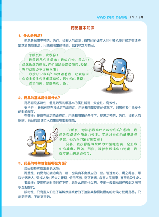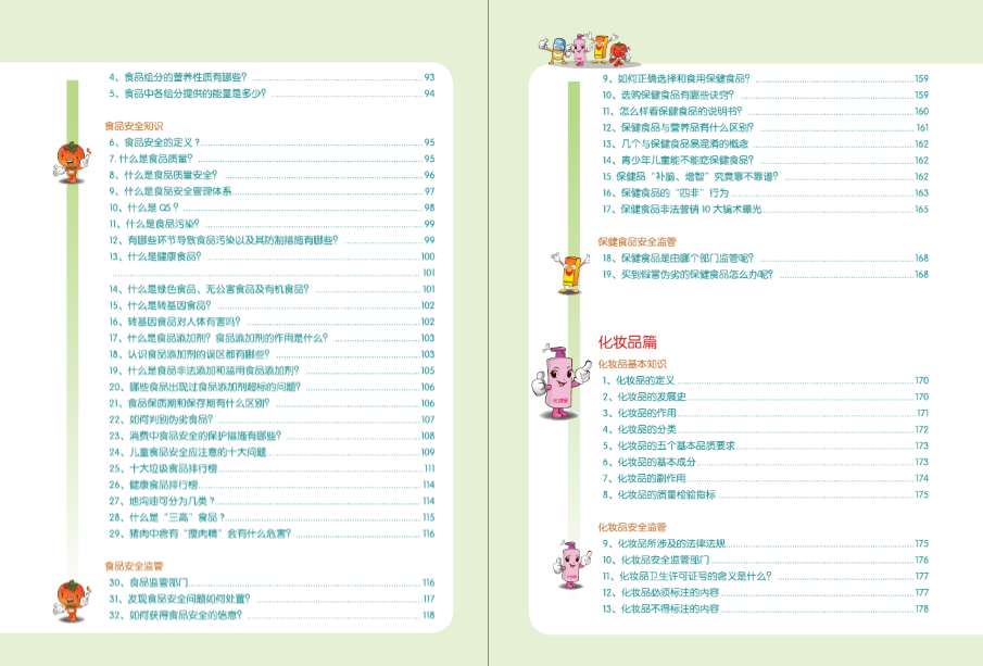 (二)該作品可讀性強。該作品創(chuàng)造性地塑造了“安安、全全、健健、康康”四個活潑可愛的卡通形象,作為健康使者,運用問答和小貼士的形式,引領讀者學習食品藥品安全知識。尤其是在每一條知識問答的小貼士中,分別以“安安、全全、健健、康康”作為藥品、食品、保健食品、化妝品的安全使者,模擬小朋友的語氣,將較為復雜的專業(yè)知識,以淺顯、生動活潑的語言娓娓道來,極大地增強了作品的可讀性。