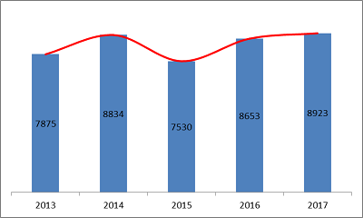 2017年,食品藥品監(jiān)管總局共批準(zhǔn)醫(yī)療器械注冊、延續(xù)注冊和許可事項(xiàng)變更注冊項(xiàng)8923。與2016年相比注冊批準(zhǔn)總數(shù)量增長3.1%。
