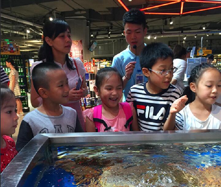 在現場體驗了月餅制作工藝后,采風團一行走進了成都市內的盒馬鮮生門店。英國面包蟹、加拿大珍寶蟹、俄羅斯帝王蟹、波士頓龍蝦……一走進6000多平方米的門店,“小記者”們便被琳瑯滿目的海鮮給迷住了。