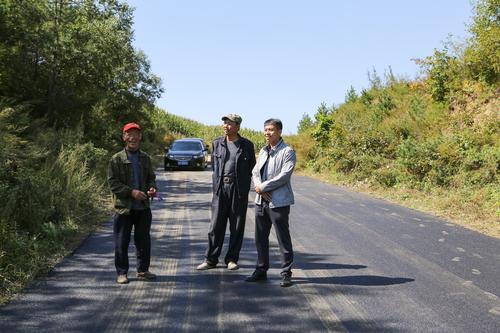 在剛剛修好的跨縣公路上,劉天一(右一)和村民展望達成村的發(fā)展前景。劉洋 攝