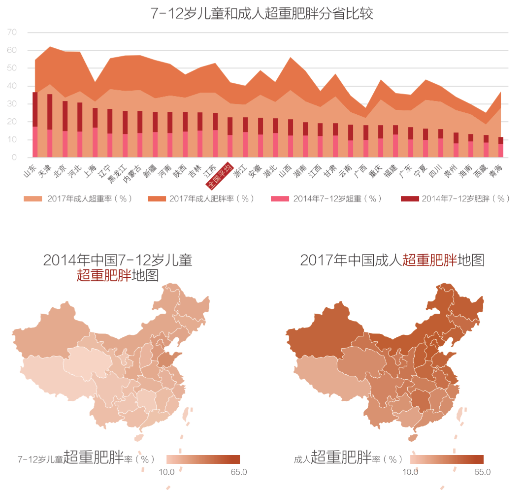 國(guó)家統(tǒng)計(jì)局和國(guó)家衛(wèi)計(jì)委的數(shù)據(jù)顯示,中國(guó)人的超重率和肥胖率均不斷上升。2014年7—12歲兒童和2017年成人超重肥胖率展現(xiàn)出較一致的分布特點(diǎn),就整體區(qū)域性而言,超重肥胖率東部高于中、西部,北方高于南方。圖表說(shuō)明:成人超重肥胖?jǐn)?shù)據(jù)來(lái)源于中國(guó)疾病預(yù)防控制中心于2017年發(fā)布的《慢性病及其危險(xiǎn)因素檢測(cè)數(shù)據(jù)報(bào)告》。