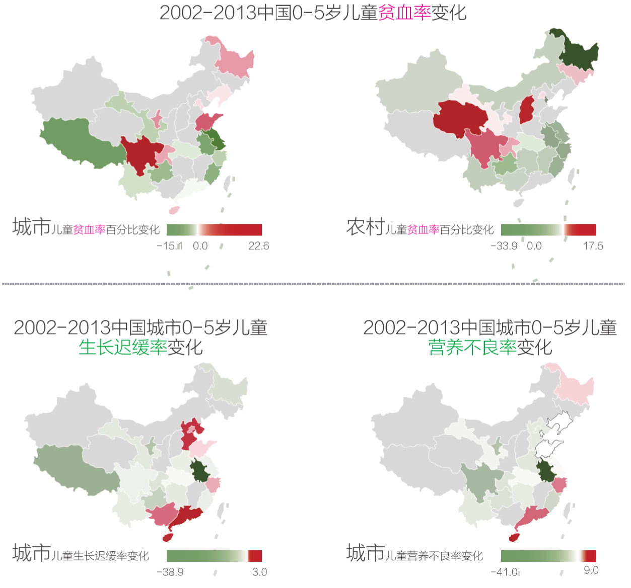 圖表說(shuō)明:將2013年減去2002年的各省指標(biāo)檢出率得出的變化值繪成地圖,紅色深淺表示指標(biāo)檢出率上升的程度,綠色深淺表示指標(biāo)檢出率下降的程度。展示的地圖中有出現(xiàn)少數(shù)省份的檢出率上升,其余指標(biāo)所有省份均為下降。超重肥胖率從2002年到2013年各省均有增加,故未展示地圖。