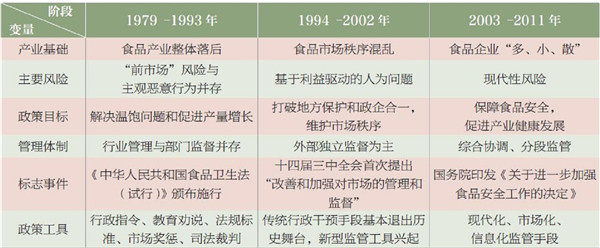回顧2011 年以前中國食品安全監(jiān)管歷程,我們發(fā)現(xiàn)其理念和實(shí)踐變遷符合歷史制度邏輯。改革開放初期,國民經(jīng)濟(jì)百廢待興,解決群眾溫飽問題是食品領(lǐng)域主要矛盾。加之當(dāng)時(shí)食品衛(wèi)生問題主要表現(xiàn)為生產(chǎn)力落后導(dǎo)致的“前市場”風(fēng)險(xiǎn),調(diào)動(dòng)行業(yè)管理部門和地方政府壯大食品產(chǎn)業(yè)的積極性成為理性選擇。因此,不論是法律法規(guī)、監(jiān)管體制抑或政策手段,都帶有鮮明的混合過渡色彩,兼具計(jì)劃體制和商品經(jīng)濟(jì)兩類特征。之后,中國食品行業(yè)無序發(fā)展,市場秩序混亂,體制弊端逐漸暴露。在社會(huì)主義市場經(jīng)濟(jì)的宏觀背景下,二次改革勢(shì)在必行。國家試圖通過全面外部監(jiān)督管理打擊地方保護(hù)和部門局部利益,將食品衛(wèi)生管理帶入法制化軌道,并提出食品安全新理念以符合全產(chǎn)業(yè)鏈條發(fā)展需求。此時(shí),盡管經(jīng)濟(jì)發(fā)展依然是“最大的政治”,但食品安全和衛(wèi)生問題顯然已經(jīng)受到政府更多關(guān)注。
