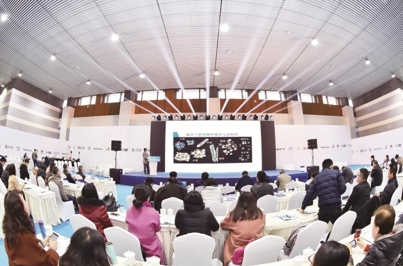 圖為北京中醫(yī)藥大學(xué)中藥品質(zhì)評價北京市重點(diǎn)實驗室主任林瑞超在研討會上展示不同藥材偏光下的草酸鈣晶體與淀粉粒。杜然浩攝