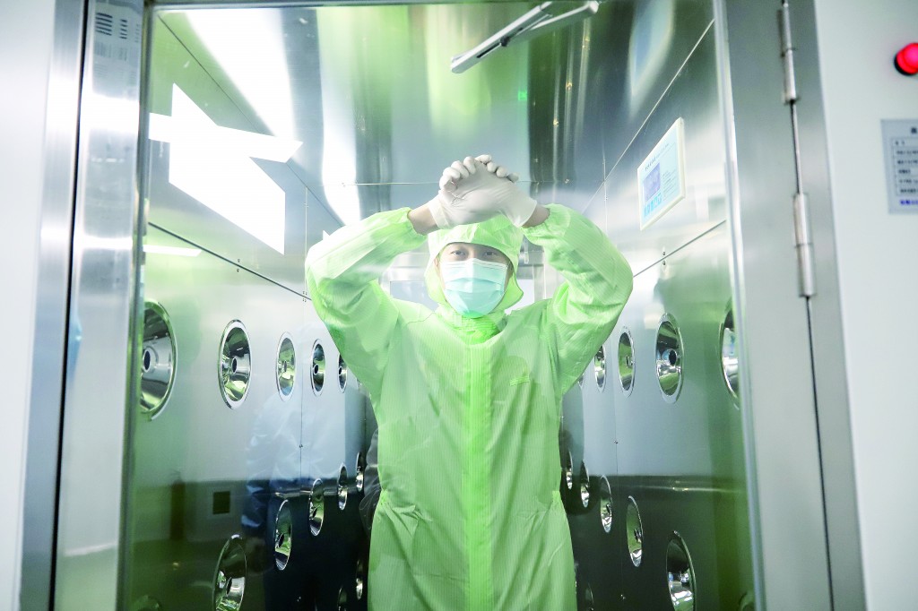 在北京全式金生物技術(shù)有限公司,監(jiān)管人員按照潔凈控制標(biāo)準(zhǔn),“全副武裝”接受風(fēng)淋。