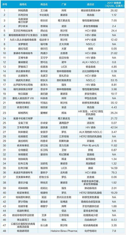 在18個抗腫瘤藥中,有13個為進口新藥。其中,有的產品因為療效的巨大優(yōu)勢在短短幾年內就發(fā)展成了重磅“炸彈”(上市5年內銷售額超過10億美元),比如輝瑞的哌柏西利、百時美施貴寶的納武利尤單抗和默沙東的帕博利珠單抗。有的產品雖然銷售額上達不到重磅“炸彈”級別,但在療效上有革命性的進步,如間變性淋巴瘤激酶(ALK)抑制劑阿來替尼,可以大幅延長ALK陽性NSCLC患者的無進展生存期(PFS),中位PFS相比化療延長一倍以上(16.6月vs 8.1月);聚ADP核糖聚合酶(PARP)抑制劑奧拉帕利,可以大幅延長BRCA突變卵巢癌患者的無進展生存期(19.1月vs 5.5月)。除延長生存期外,患者的獲益還包括生活質量大幅改善,很多腫瘤患者在靶向藥物的控制下,精神狀態(tài)甚至與常人無異。