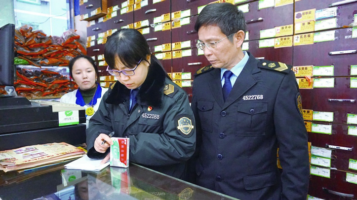 圖為執(zhí)法人員在田林縣舊州鎮(zhèn)一家藥店檢查含麻黃堿類藥品銷售情況。本報記者 李舒雯 通訊員 馮瑞萍 攝影報道