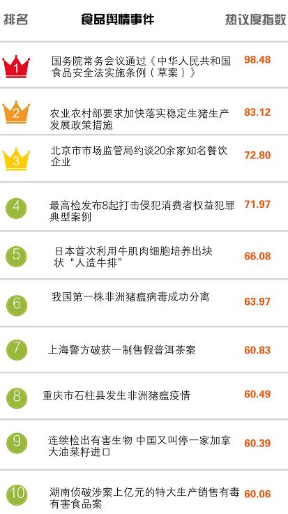 食品輿情排行榜|《中國人民共和國食品安全法實(shí)施條例(草案)》通過