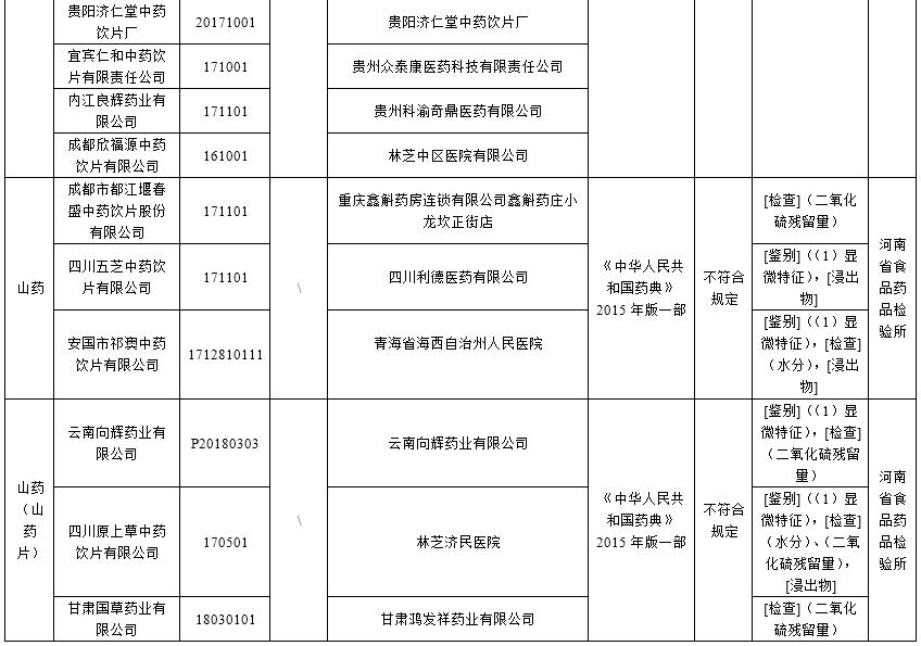 經(jīng)河南省食品藥品檢驗所檢驗,標示為安國市祁澳中藥飲片有限公司、成都市都江堰春盛中藥飲片股份有限公司、四川五芝中藥飲片有限公司、四川原上草中藥飲片有限公司、云南向輝藥業(yè)有限公司、甘肅國草藥業(yè)有限公司生產(chǎn)的6批次山藥不符合規(guī)定,不符合規(guī)定項目包括顯微特征、水分、浸出物、二氧化硫殘留量。