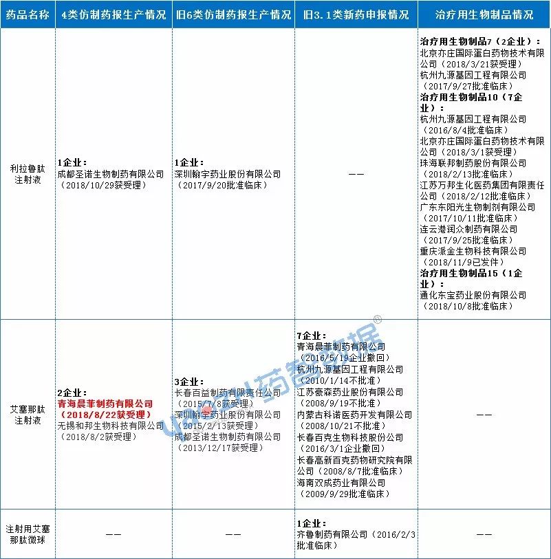 GLP-1類藥物近年來市場發(fā)展迅速,2018年,GLP-1受體激動劑類藥物市場規(guī)模達到93億美元,增長率高達25%。目前國內(nèi)仿制布局企業(yè)不算太多,布局品種集中在利拉魯肽、艾塞那肽上。進度較快的為成都圣諾生物的利拉魯肽注射液、青海晨菲制藥有限公司及無錫和邦生物科技有限公司的艾塞那肽注射液。