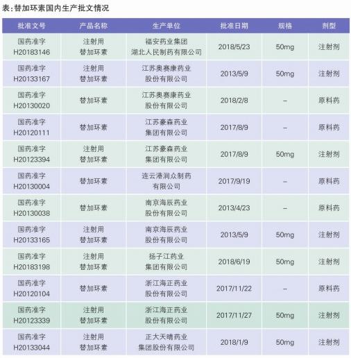 目前,多家國(guó)內(nèi)藥企同時(shí)擁有替加環(huán)素的原料藥和制劑生產(chǎn)文號(hào)(見(jiàn)表),具備了從原料藥到制劑的完整產(chǎn)業(yè)鏈。在當(dāng)前集采控費(fèi)的背景下,同時(shí)擁有原料藥和制劑生產(chǎn)批文的廠家在控制整體成本上具有更大的空間,在市場(chǎng)持續(xù)競(jìng)爭(zhēng)上更有優(yōu)勢(shì)。后續(xù)這樣的企業(yè)還有可能增加。