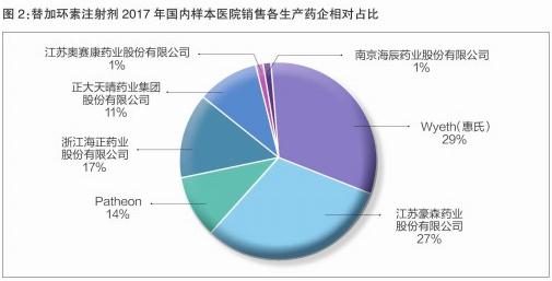 2017年,替加環(huán)素進(jìn)口產(chǎn)品的市場(chǎng)份額為43%,下降明顯;國(guó)產(chǎn)產(chǎn)品的市場(chǎng)份額上升明顯,其中,江蘇豪森藥業(yè)2017年的市場(chǎng)份額增至27%;另一家市場(chǎng)份額一直在上升的國(guó)內(nèi)藥企為正大天晴,2017年市場(chǎng)份額占比為11%。估計(jì)這種趨勢(shì)后續(xù)將更加明顯(見(jiàn)圖2)。