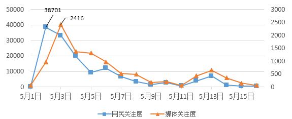 從輿情走勢(shì)來(lái)看,以5月2日~5月16日為監(jiān)測(cè)時(shí)間段,如圖1所示,輿情整體呈現(xiàn)“波浪式”特征,網(wǎng)民關(guān)注度遠(yuǎn)高于媒體關(guān)注度。