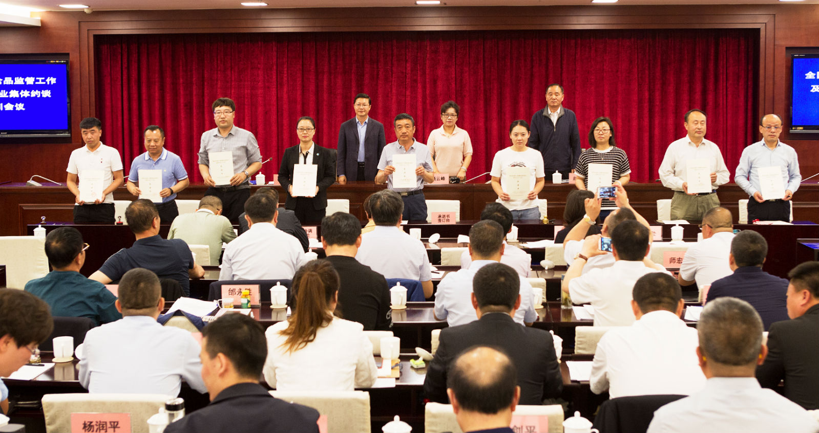 圖為內(nèi)蒙古自治區(qū)市場(chǎng)監(jiān)督管理局召開(kāi)特殊食品監(jiān)管工作及生產(chǎn)企業(yè)集體約談培訓(xùn)會(huì)上 企業(yè)代表簽訂承諾書后合影。楊燕/攝