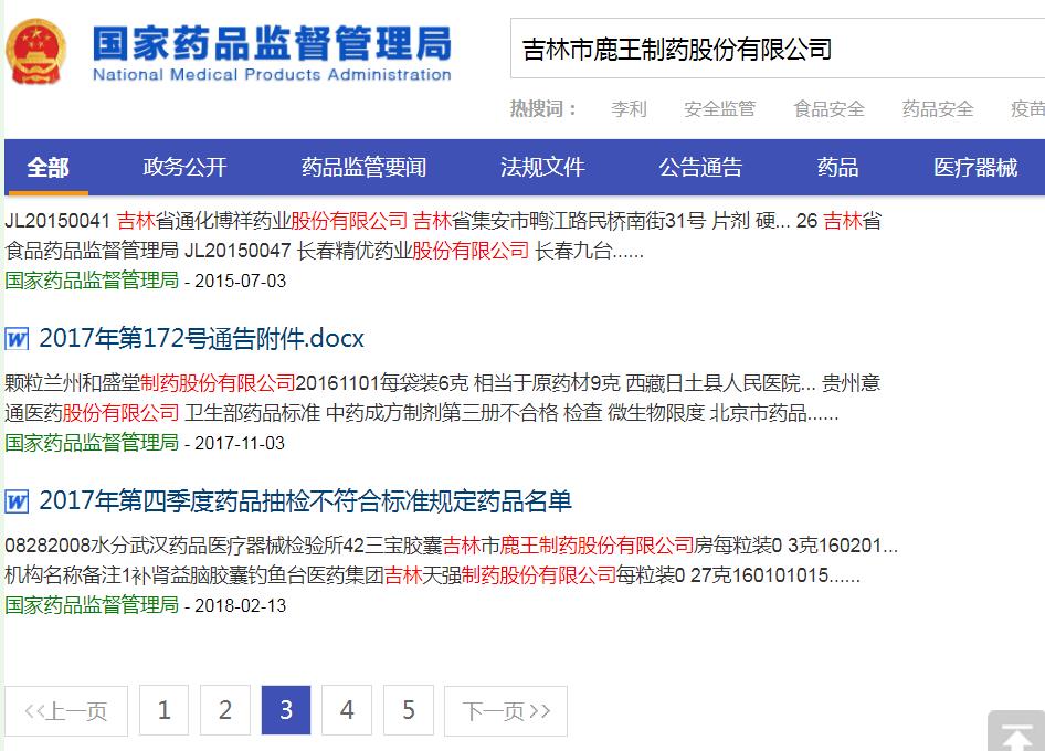 記者查閱國(guó)家藥監(jiān)局官網(wǎng)得知,在2018年8月24日、2018年7月3日、2018年2月13日、2017年1月11日國(guó)家藥品監(jiān)管部門(mén)發(fā)布的藥品不合格名單與不符合標(biāo)準(zhǔn)規(guī)定的藥品名單中,都出現(xiàn)了標(biāo)示為吉林市鹿王制藥股份有限公司生產(chǎn)的產(chǎn)品。