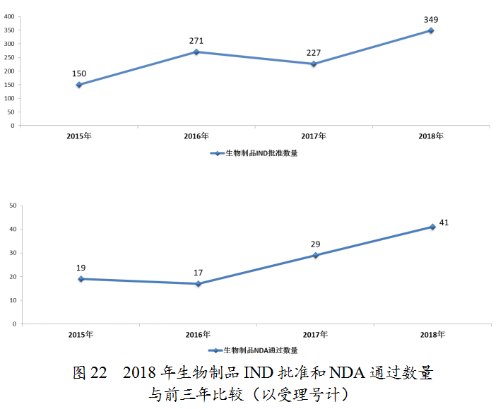 藥審中心審評通過批準(zhǔn)預(yù)防用IND 33件,批準(zhǔn)治療用IND 316件;審評通過預(yù)防用NDA 11件、治療用NDA 30件。2018年完成審評的生物制品各類注冊申請具體情況詳見表3,生物制品IND批準(zhǔn)和NDA通過量與前三年比較(以受理號計(jì))詳見圖22。