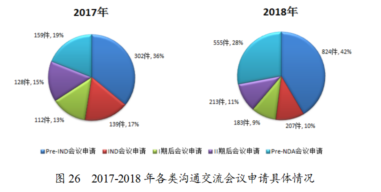 2018年收到溝通交流會議申請1982件,其中Pre-IND會議申請和Pre-NDA會議申請占比例較多,分別為42%和28%。與2017年比較,Pre-IND會議申請和Pre-NDA會議申請所占比例增長較明顯,2017至2018年各類溝通交流會議申請具體情況見圖26。