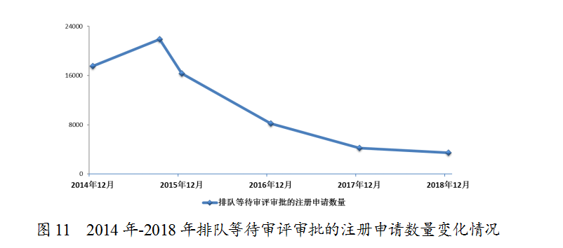 2018年底排隊(duì)等待審評審批的注冊申請已由2015年9月高峰時的近22000件降至3440件(不含完成審評因申報(bào)資料缺陷等待申請人回復(fù)補(bǔ)充資料的注冊申請),進(jìn)一步鞏固了44號文件要求解決注冊申請積壓的成效。2014年-2018年排隊(duì)等待審評審批的注冊申請數(shù)量變化情況詳見圖11。