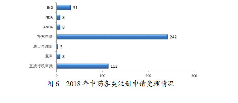 2018年,藥審中心受理1-6類中藥新藥注冊申請共37個品種,其中,受理中藥NDA 8個品種,較2017年增長了7倍;受理中藥IND 29個品種,且有1個品種為1類中藥創(chuàng)新藥IND申請。