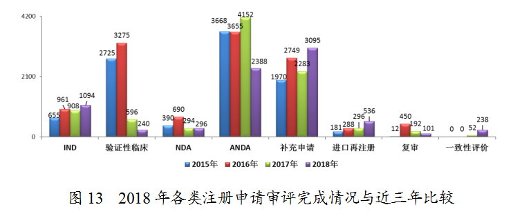 藥審中心完成IND申請審評1094件,完成NDA審評296件,完成ANDA審評2388件,2018年各類注冊申請審評完成情況與近三年比較詳見圖13。