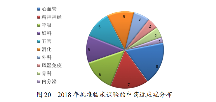 藥審中心審評通過批準(zhǔn)臨床試驗(yàn)的中藥IND申請44件,涉及10個適應(yīng)癥領(lǐng)域,其中心血管、精神神經(jīng)、呼吸較多,共占48%,具體治療領(lǐng)域分布詳見圖20。