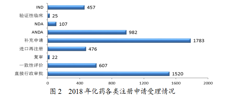 2018年,藥審中心受理的7336件新注冊申請中,化藥注冊申請受理量為5979件,占2018年全部注冊申請受理量的82%,2018年各類藥品注冊申請受理情況與近三年比較詳見圖1。