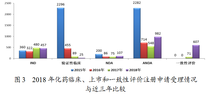 藥審中心受理化藥注冊申請共5979件,其中受理化藥NDA申請107件,較2017年增長了43%;受理仿制藥上市申請(ANDA)982件,較2017年增長了79%?;幐黝愖陨暾埵芾砬闆r詳見圖2。2018年化藥臨床、上市和一致性評價注冊申請受理情況與近三年比較詳見圖3。