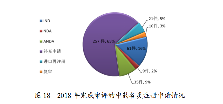 藥審中心完成審評的中藥注冊申請393件,其中完成IND申請61件,完成NDA 9件,完成ANDA 35件。完成審評的中藥各類注冊申請情況詳見圖18。