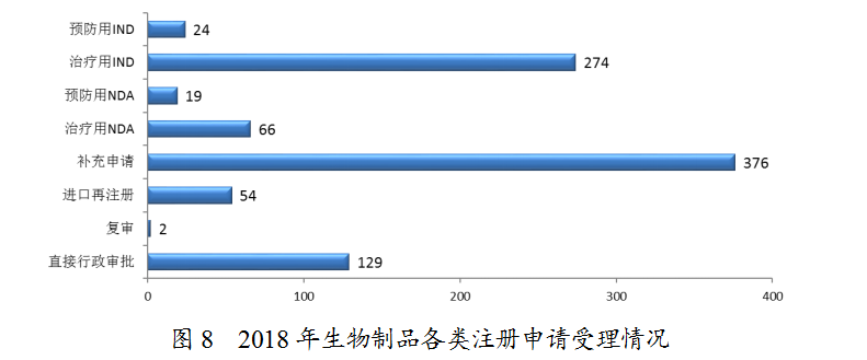 藥審中心受理1類生物制品創(chuàng)新藥注冊申請123件(包括預(yù)防用生物制品6件,治療用生物制品117件),較2017年增長了62%。其中,受理1類生物制品NDA 11件(包括預(yù)防用生物制品2件,治療用生物制品9件,共涉及9個品種),較2017年增長了4.5倍;受理1類生物制品IND 112件(包括預(yù)防用生物制品4件,治療用生物制品108件,共涉及97個品種),較2017年增長了51%。
