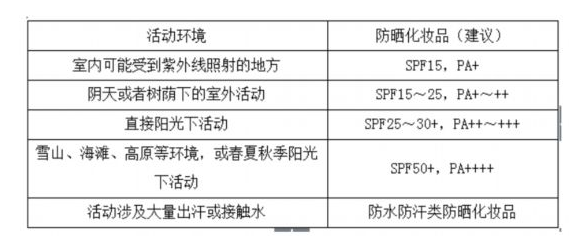 為了全面防護,要選擇既能防護UVB又能防護UVA的防曬化妝品,即產(chǎn)品標(biāo)簽標(biāo)識有SPF值和PA等級或廣譜防曬的產(chǎn)品。那么是不是直接購買SPF值最大,PA“+”最多的防曬化妝品就最好呢?其實不然。雖然SPF值越大、PA“+”越多的產(chǎn)品防曬效果越好,但同時也意味著添加的防曬劑含量越高或者成分越復(fù)雜,過度使用會加重皮膚的負(fù)擔(dān),甚至還可能引起皮膚不良反應(yīng)。因此應(yīng)根據(jù)環(huán)境條件選用防曬化妝品,具體情況可參考下表。