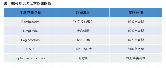 其中,共軛聯(lián)結(jié)基團已成為改變多肽藥物性質(zhì)的重要手段。從2010年起,全球約有30%處在臨床試驗階段的多肽藥物是結(jié)合物,比如與聚乙二醇、脂質(zhì)和蛋白質(zhì)等結(jié)構(gòu)偶聯(lián)。研究證明,綴合Fc片段能延長多肽半衰期,多肽藥物偶聯(lián)物還能用作細胞毒性劑的有效載荷和傳遞物(部分常見多肽藥物偶聯(lián)物見表)。
