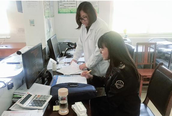 圖為執(zhí)法人員在大河鄉(xiāng)衛(wèi)生院檢查疫苗驗(yàn)收記錄。(圖/黃何飛 攝)