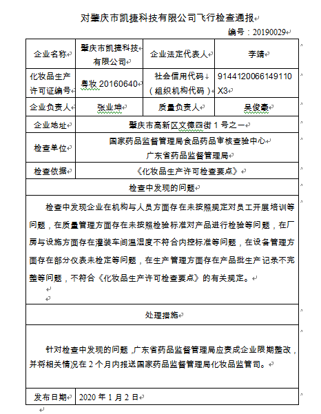 飛檢通報(bào):對肇慶市凱捷科技有限公司飛行檢查通報(bào)
