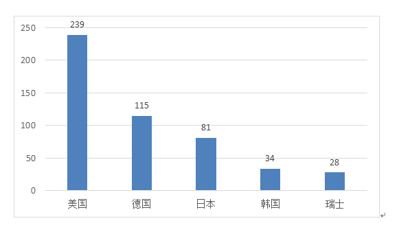 2019年,美國、德國、日本、韓國、瑞士醫(yī)療器械在中國醫(yī)療器械進口產(chǎn)品首次注冊數(shù)量排前5位,注冊產(chǎn)品數(shù)量約占2019年進口產(chǎn)品首次注冊總數(shù)量的75.4%,與2018年相比基本持平。