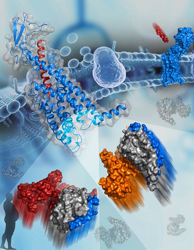 胰高血糖素受體GCGR的三維結(jié)構(gòu)示意圖。GCGR參與調(diào)節(jié)人體內(nèi)血糖穩(wěn)態(tài),是治療2型糖尿病藥物的重要靶點(diǎn)。圖中左上角GCGR的三維結(jié)構(gòu)以藍(lán)色飄帶圖顯示,GCGR的天然配體胰高血糖素以紅色飄帶顯示;圖下方為與GCGR結(jié)合的兩種G蛋白,以表面圖顯示,其中,Gs蛋白的三個亞基分別用橙色、灰色和藍(lán)色顯示,Gi蛋白的三個亞基分別用紅色、灰色和藍(lán)色顯示。(圖片由中科院上海藥物所吳蓓麗研究組提供)