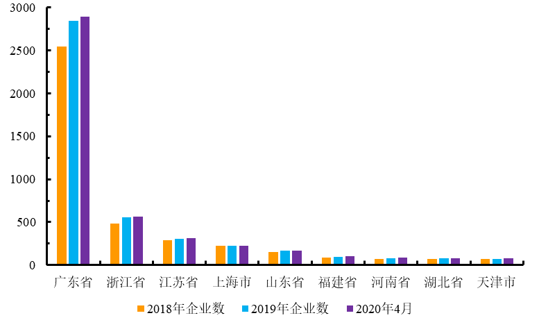 2018年~2020年國(guó)內(nèi)主要省市化妝品獲許可證企業(yè)數(shù)量