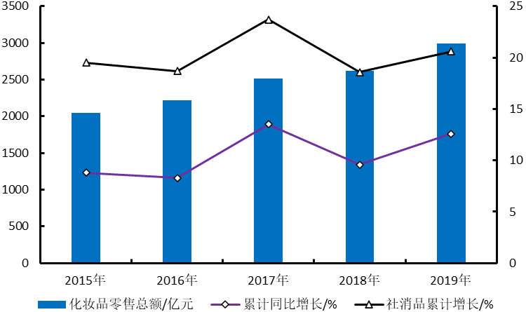2019年1月~2019年12月國(guó)內(nèi)化妝品零售及社會(huì)消費(fèi)品銷售額走勢(shì)