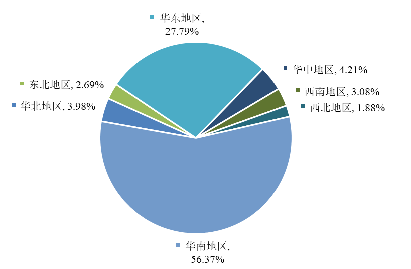 按照地區(qū)分布來(lái)看,2019年華北地區(qū)獲許化妝品生產(chǎn)企業(yè)合計(jì)207家,占比3.98%;東北地區(qū)合計(jì)140家,占比2.69%;華東地區(qū)合計(jì)1446家,占比27.79%;華中地區(qū)合計(jì)219家,占比4.21%;西南地區(qū)合計(jì)160家,占比3.08%;西北地區(qū)合計(jì)98家,占比1.88%;華南地區(qū)合計(jì)2933家,占比56.37%。
