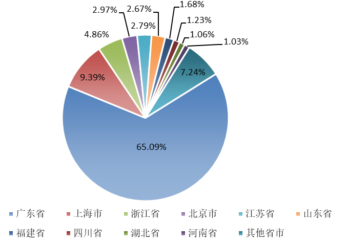 2018年國(guó)內(nèi)非特化妝品累計(jì)備案數(shù)量達(dá)到375152件,2019年全年新增備案數(shù)量接近16萬(wàn)件,截止到2019年12月31日,全部非特化妝品備案數(shù)量累計(jì)達(dá)到533425件,較2018年同比增長(zhǎng)42.19%。其中,廣東省累計(jì)備案數(shù)341624件,占比65.09%;上海市累計(jì)備案數(shù)量53846件,占比9.39%;排名三至五名的省市分別是浙江省、北京市和江蘇省,2019年非特化妝品累計(jì)備案數(shù)分別為26752件、17157件和14643件,排名前五省市合計(jì)備案數(shù)達(dá)到454022件,占比85.10%。
