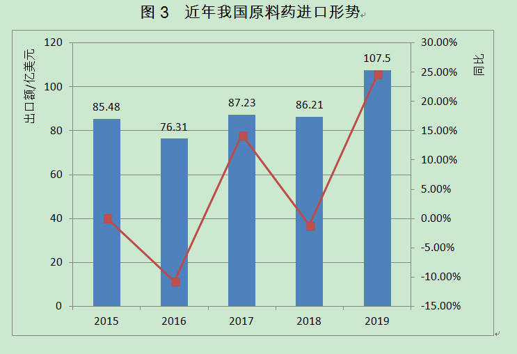 我國既是原料藥生產和出口大國,又是需求和進口大國。近年來我國原料藥進口規(guī)模呈現(xiàn)逐年擴大的趨勢,2019年我國原料藥進口額再創(chuàng)歷史新高,達到107.5億美元,同比增長24.7%。從需求的角度來看,進口大增的原因一是仿制藥一致性評價的深入推進,加大了國內對境外高品質原料藥的需求;二是國內環(huán)保安全形勢持續(xù)嚴峻,部分企業(yè)因環(huán)保問題停產或搬遷而導致供應短缺;三是國內有些原料藥品種壟斷控銷盛行導致價格漲幅太高;四是跨國企業(yè)為拓展中國市場,加大從境外采購原料藥的力度。