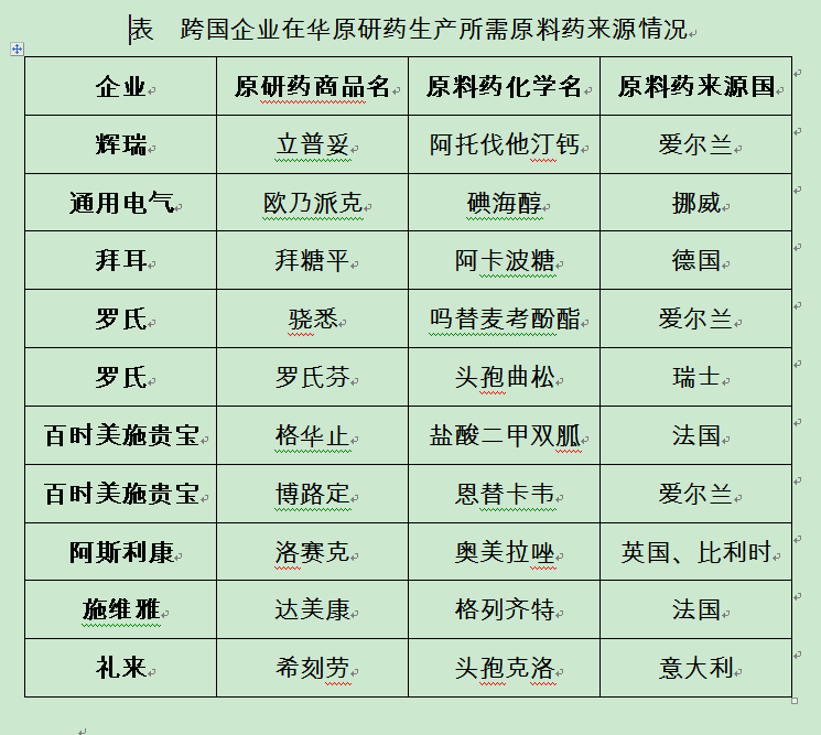 表 跨國企業(yè)在華原研藥生產所需原料藥來源情況