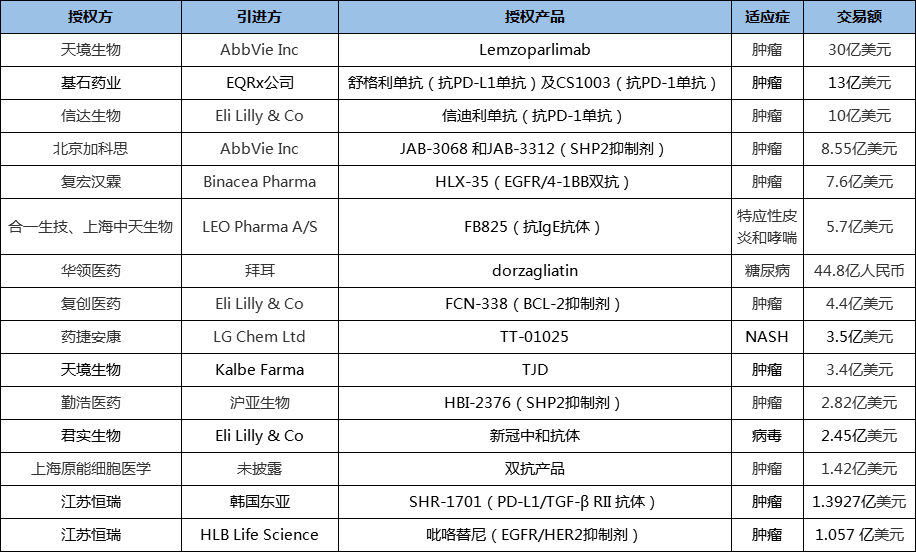 2020年國內(nèi)企業(yè)License-out前15的項目