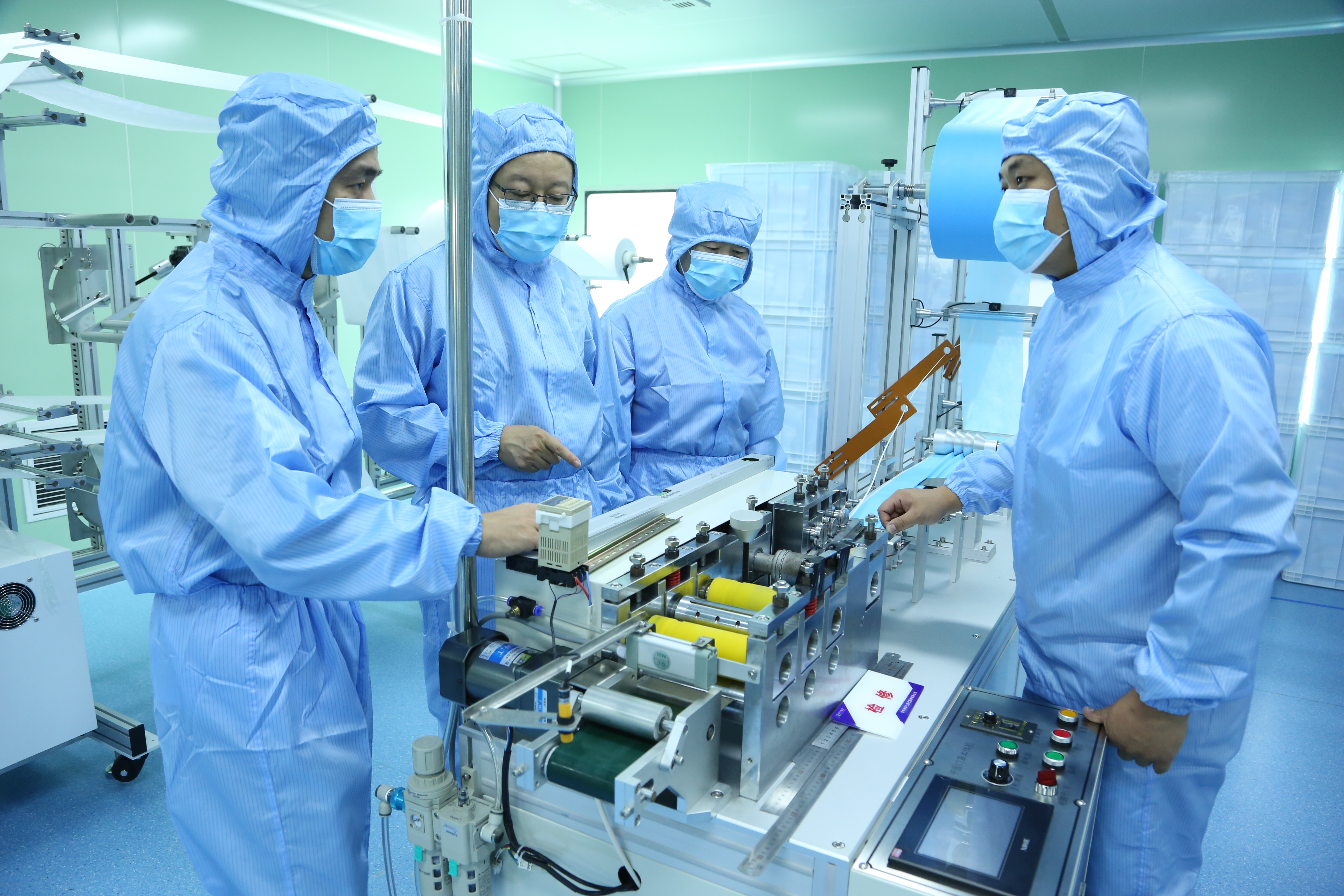 (圖為吉林省藥監(jiān)局技術(shù)幫扶組指導(dǎo)口罩生產(chǎn)企業(yè)提質(zhì)增效)