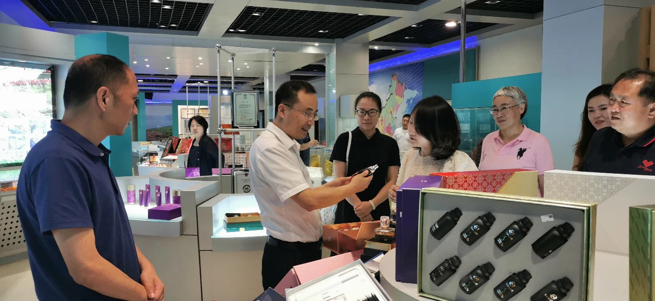 圖為吉林省藥監(jiān)局藥品安全總監(jiān)李金波(左二)調研化妝品生產企業(yè)。